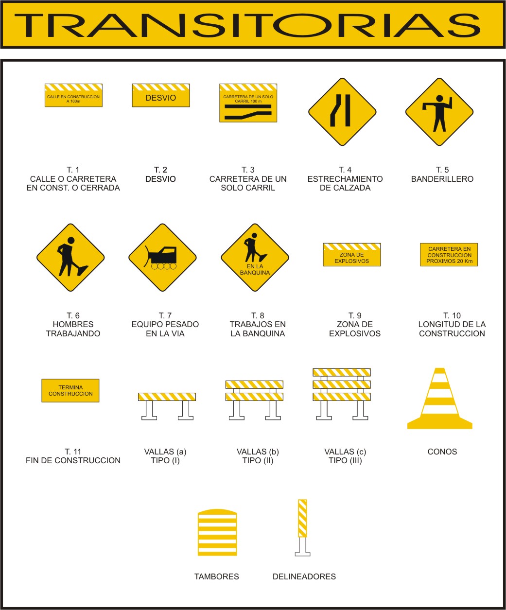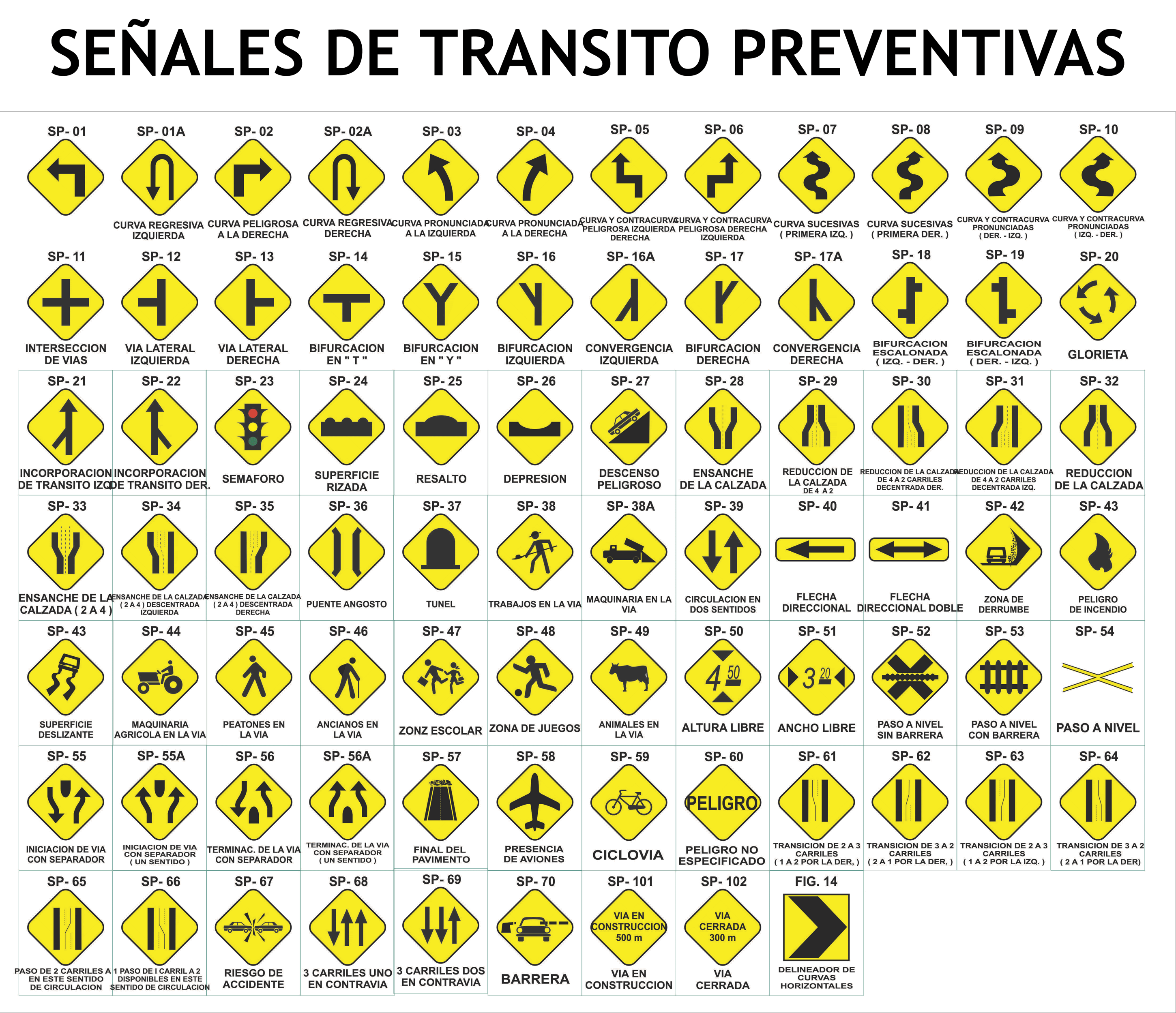 La función de estas señales es mostrar al conductor los riesgos o factores de atención existentes en el recorrido. Estas señales son de color amarillo con símbolos y letras negras